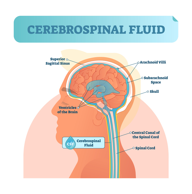 CEREBROSPINAL FLUID (CSF): circulates up to the brain in the intrathecal space (space that holds the spinal cord), through the brain sinuses, then back down around the spine again. Running in the center of and around the spinal cord, this fluid is the same as that which cushions the brain. It is both produced and resorbed in a balance and cushions the brain from impacts against the skull.