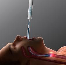 - If the glow is seen somewhere other than the midline at the level of the hyoid bone, withdraw the unit 2 cm or reposition as indicated by the light.