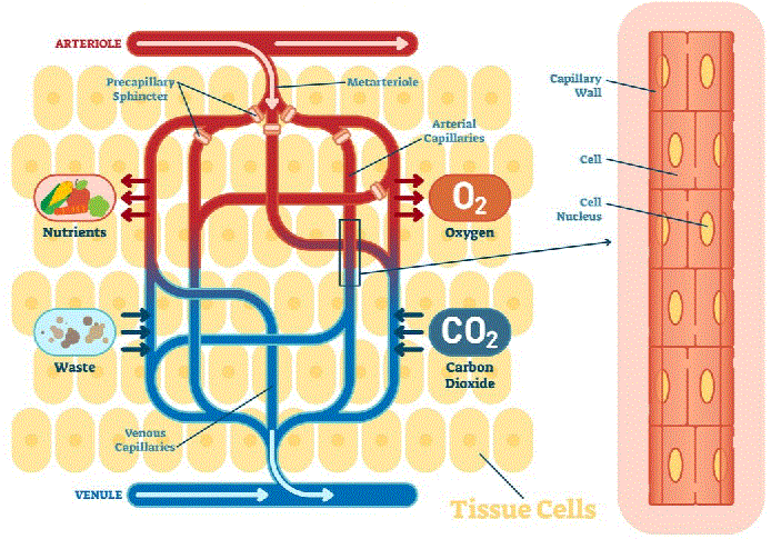 PULMONARY CAPILLARIES: Deoxygenated blood enters the pulmonary arteries from the right side of the heart and is delivered to the pulmonary capillaries, the smallest blood vessels inside the lungs attached to the walls of the alveoli.