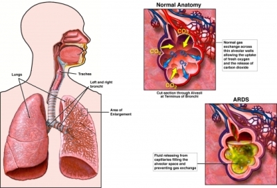 Acute respiratory distress syndrome (ARDS) is a severe inflammatory lung injury to the vascular endothelium and the alveolar epithelium. The inflammation can be the result of either direct or indirect insult to the lung. Direct injury can be from pneumonia or aspiration of gastric contents. Indirect, or extra pulmonary, injury to the lung can happen in the form of sepsis, shock, bacterial pneumonia, multiple traumas or aspiration pneumonia, with sepsis-related ARDS having the greatest overall severity, poorest recovery and highest mortality. Regardless of the specific cause, increased cell permeability results in a clinical condition in which the lungs are wet, heavy, hemorrhagic and stiff. This causes decreased perfusion capacity across the alveolar membranes, making them non-compliant; requiring the patient to increase the pressure within the airway to breathe.